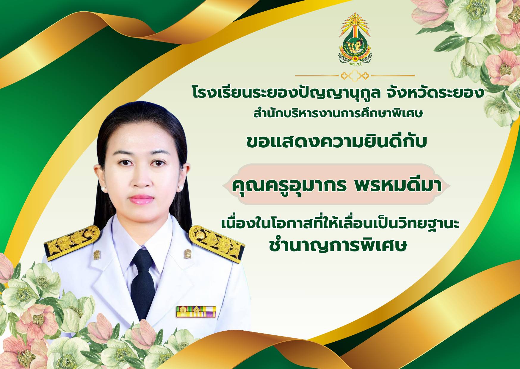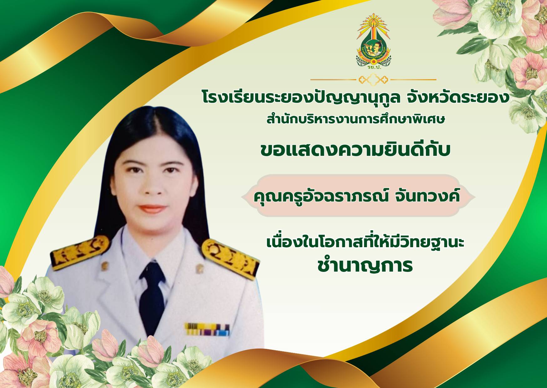 ขอแสดงความยินดีกับ คุณครูอุมากร พรหมดีมา เนื่องในโอกาสที่ให้เลื่อนเป็นวิทยฐานะ ชำนาญการพิเศษ คุณครูอัจฉราภรณ์ จันทวงค์ เนื่องในโอกาสที่ให้มีวิทยฐานะชำนาญการ คุณครูธนภรณ์ วงษ์จันทร์ เนื่องในโอกาสที่ให้มีวิทยฐานะชำนาญการ